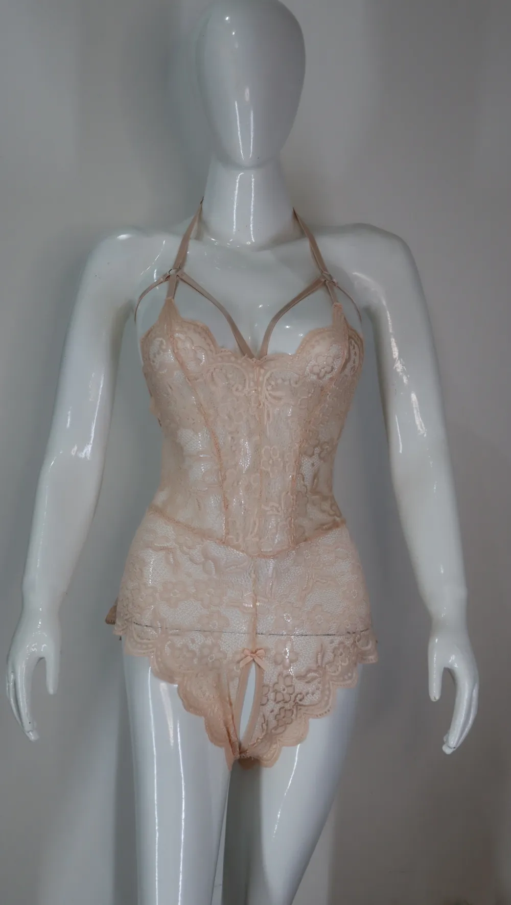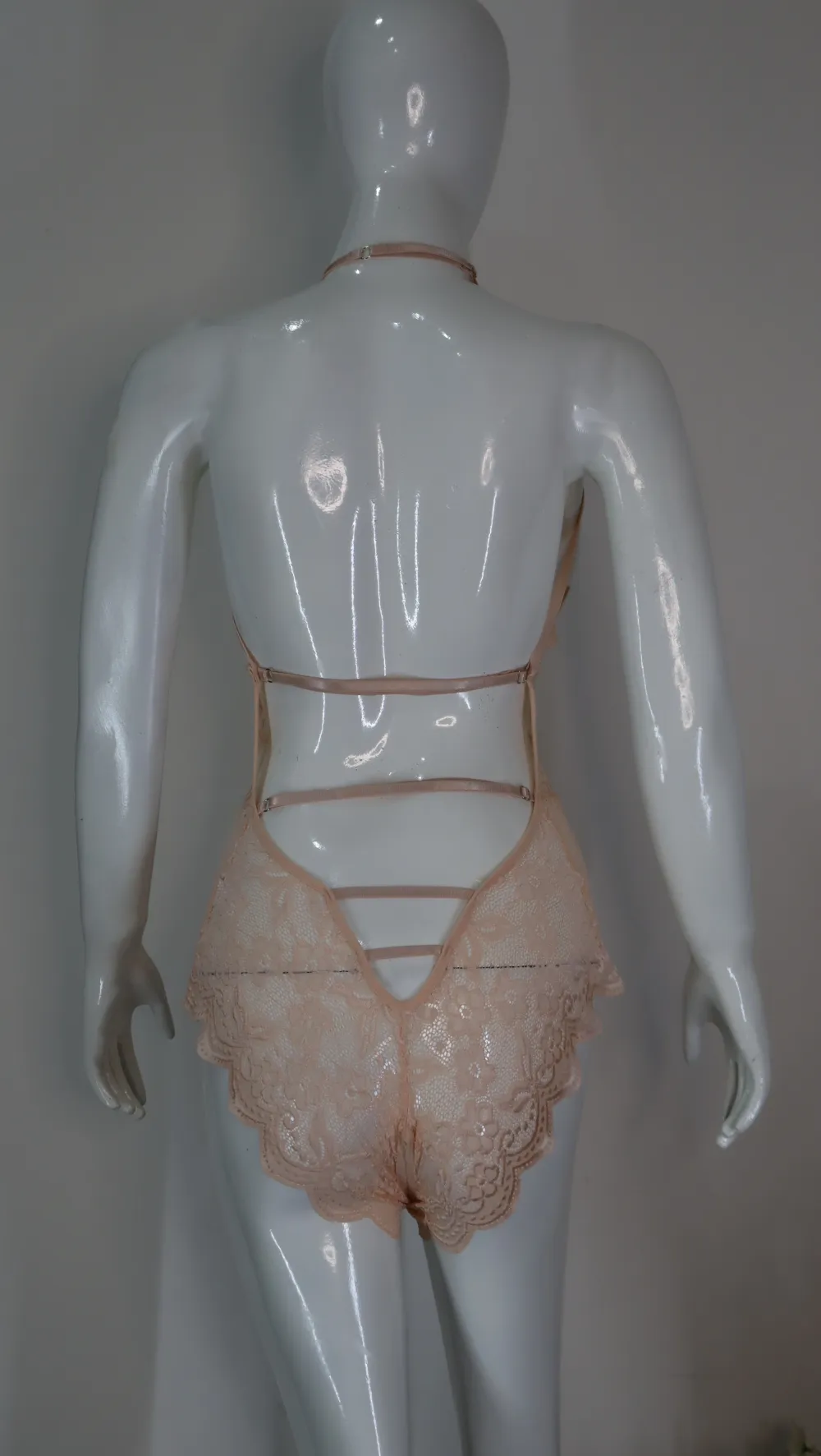 A delicate lace romper designed for special moments. Scalloped edges and floral lace overlay create a refined, feminine silhouette. Thin halter straps provide support and a clean neckline, while a fitted bodice and short, layered panty-like hem keep the shape structured and flattering.