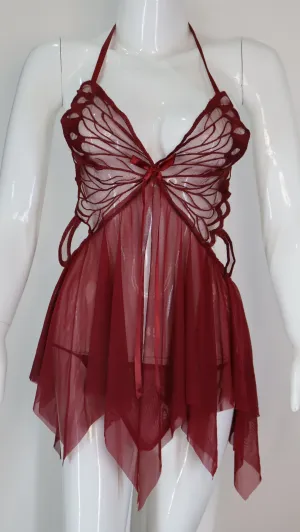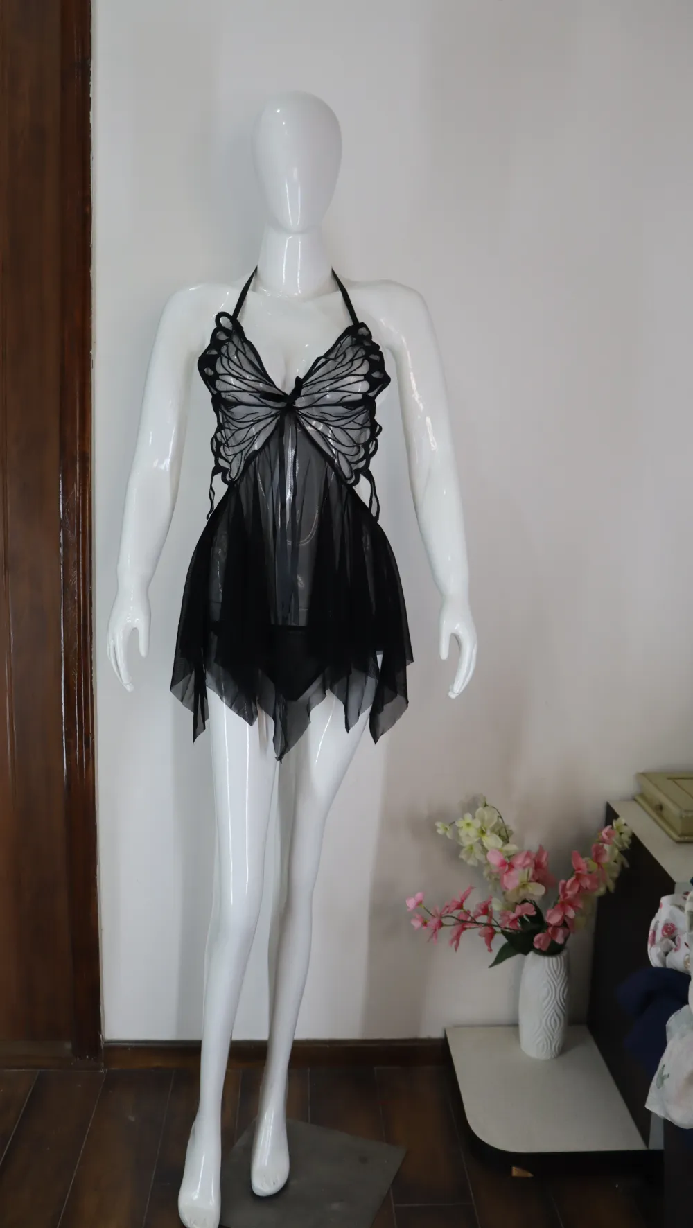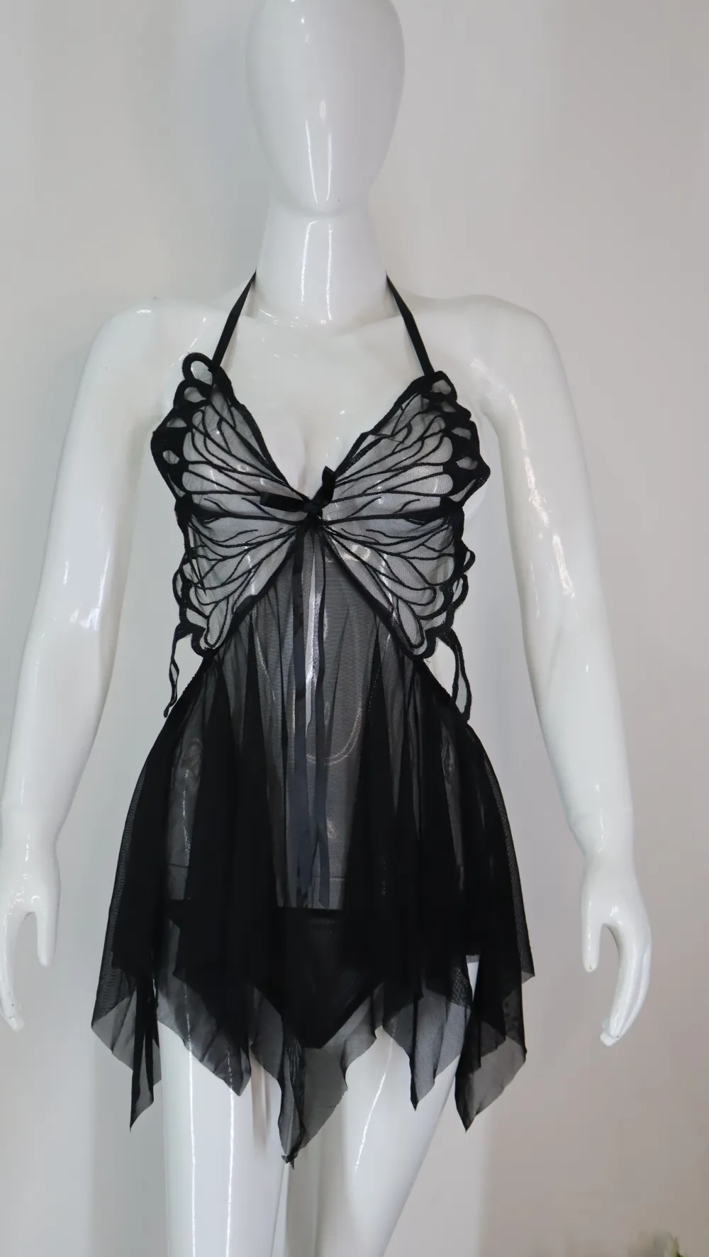 Elevate your intimate wardrobe with the Butterfly Whisper sheer lingerie dress, designed to blend artistry with irresistible allure. The bodice showcases delicately embroidered butterfly wings over soft mesh, creating a captivating and feminine silhouette. A dainty center ribbon tie adds a romantic touch, while the layered translucent skirt flows gracefully for an ethereal finish.