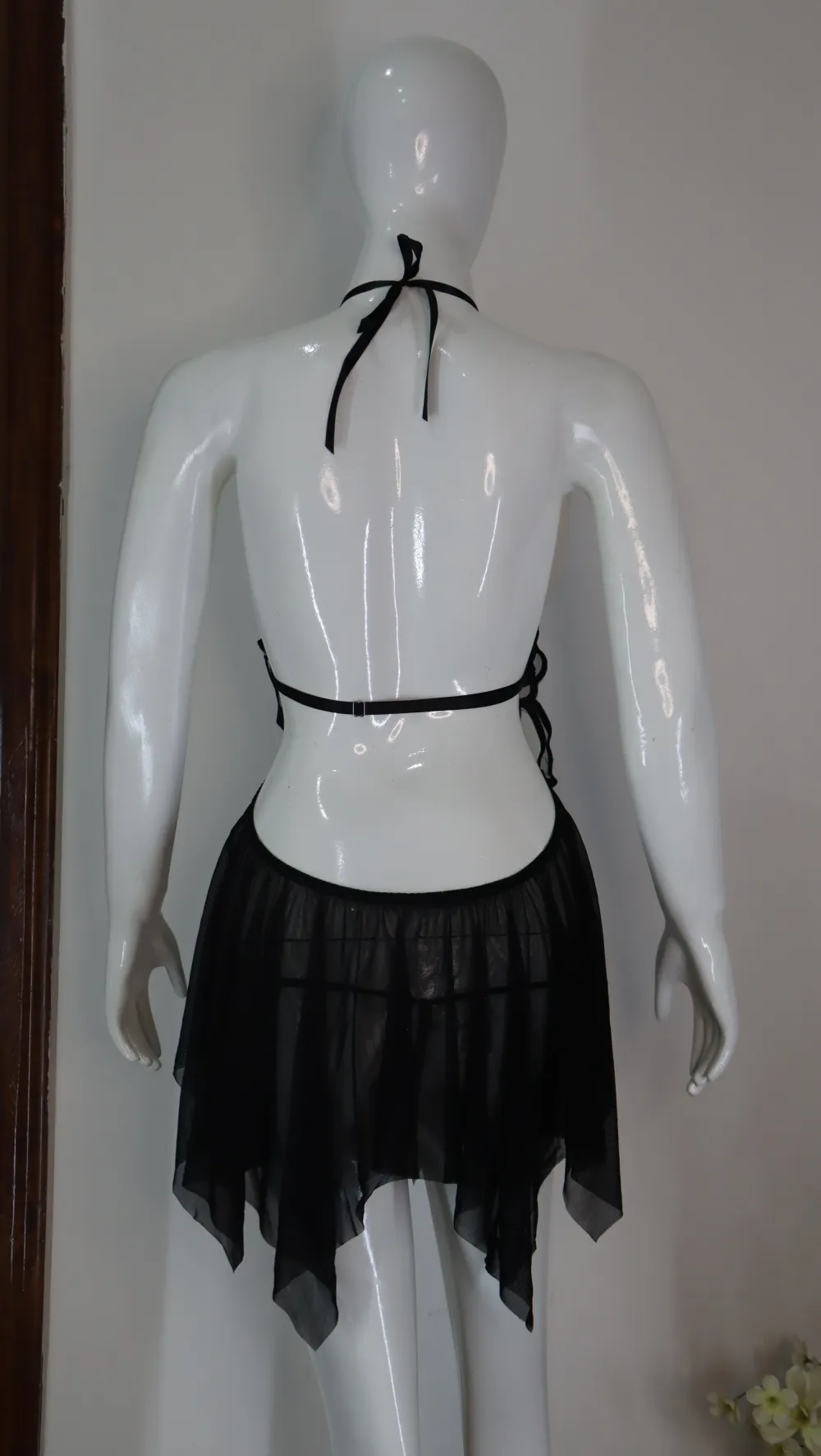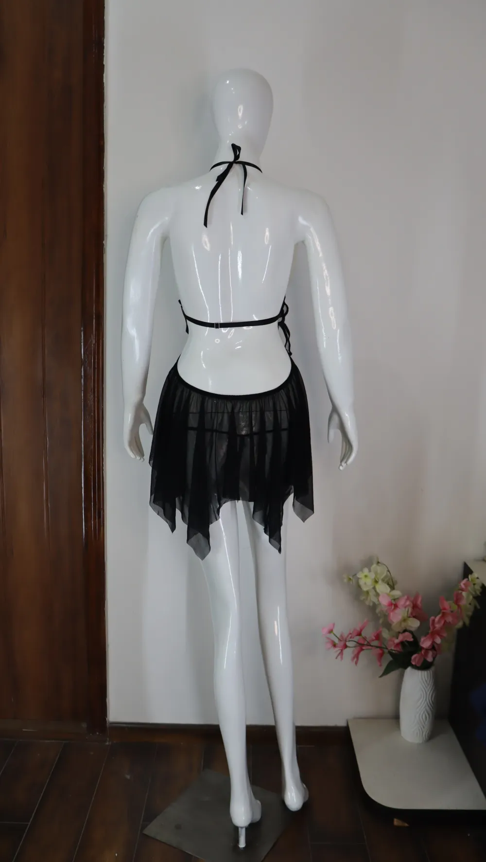To complete the look, this set includes a matching G-string thong, crafted to pair seamlessly with the dress for a confident, coordinated ensemble. Perfect for special evenings or luxurious self-indulgence, this piece offers both elegance and comfort.