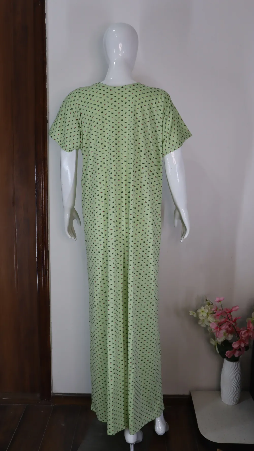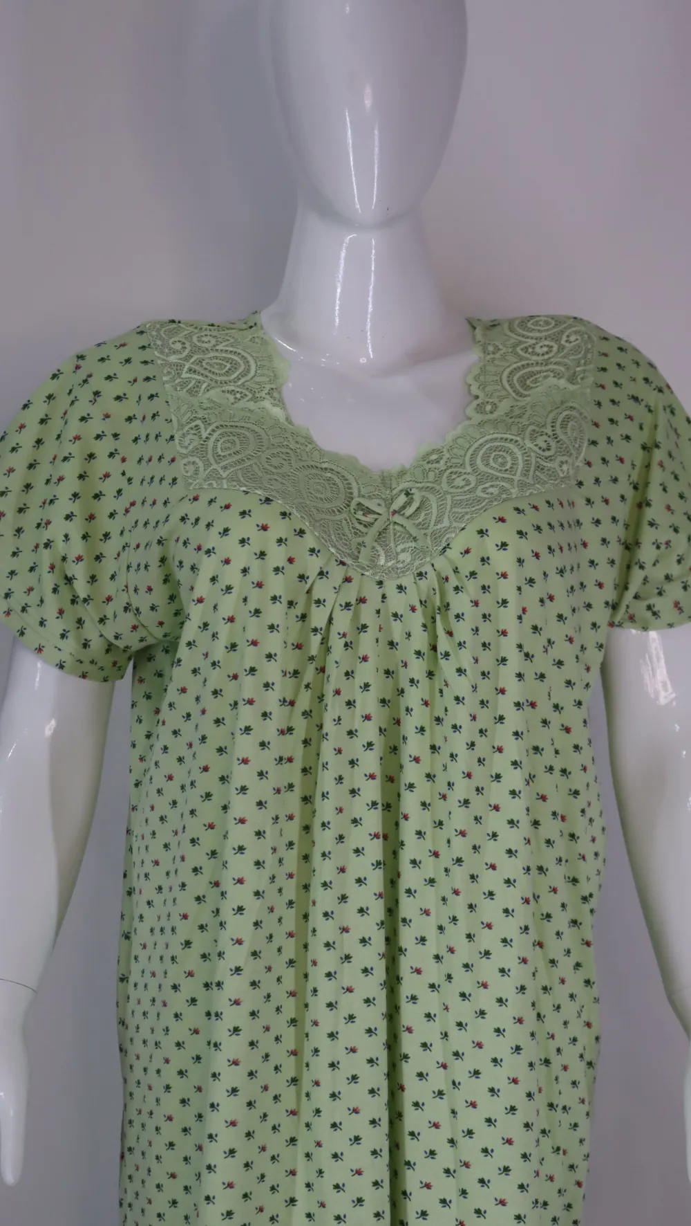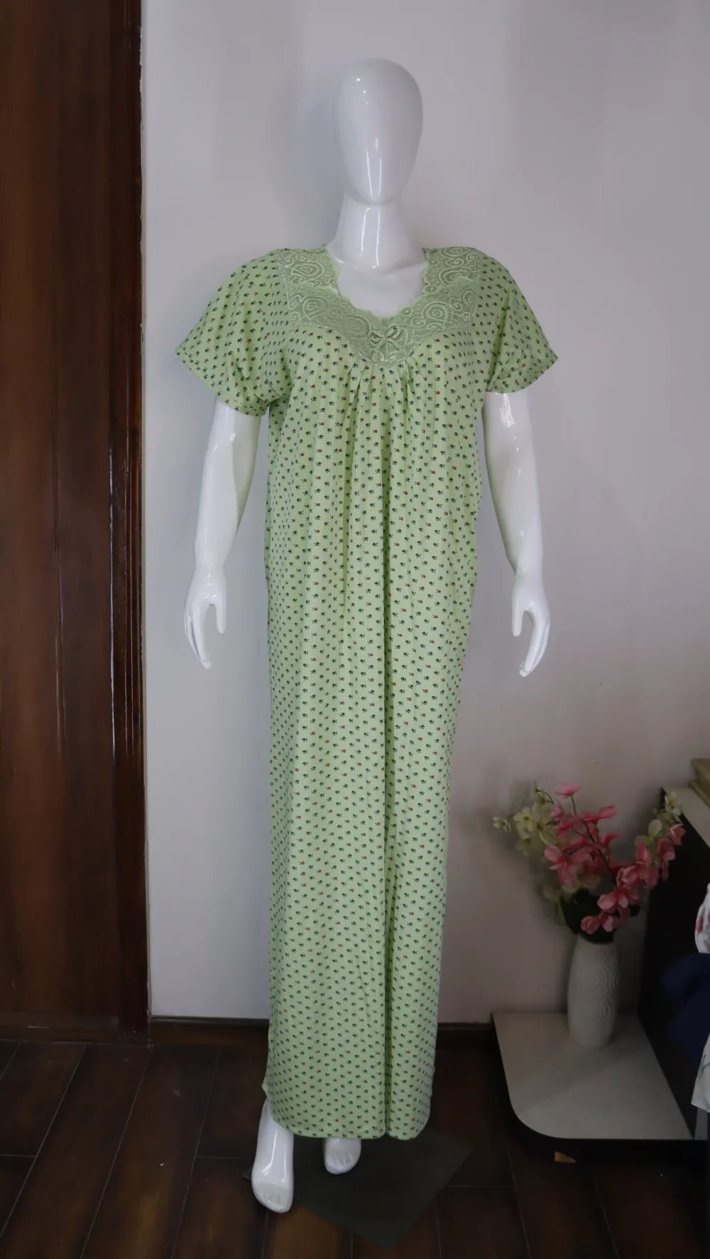 • Light Green color Premium hosiery night gown with lace detailing around the collar