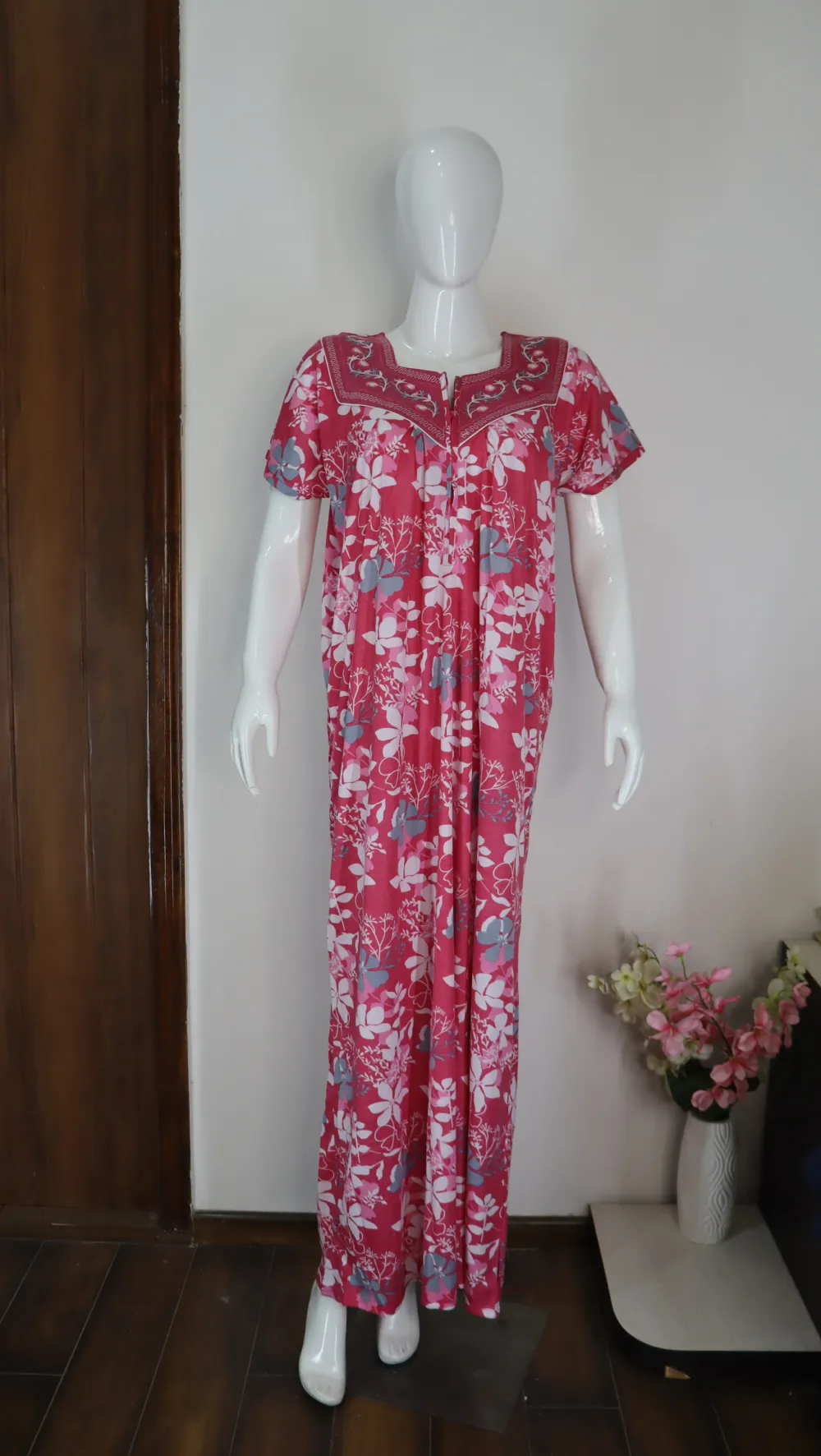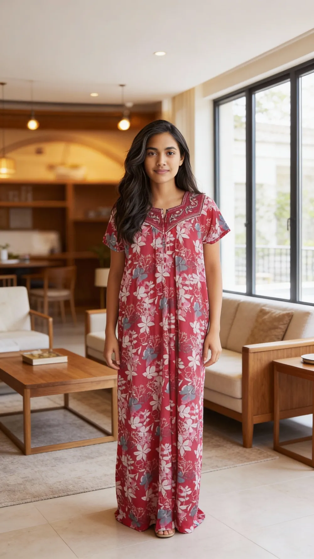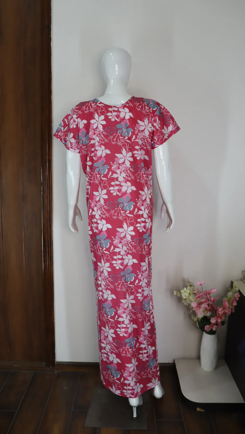 Unwind in style with our premium-quality blue floral night gown, crafted to blend comfort with timeless charm. Made from soft, breathable hosiery fabric, this gown ensures a relaxed fit while keeping you effortlessly elegant from dusk till dawn.